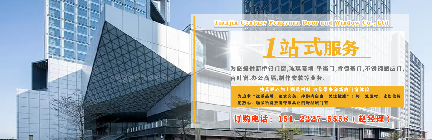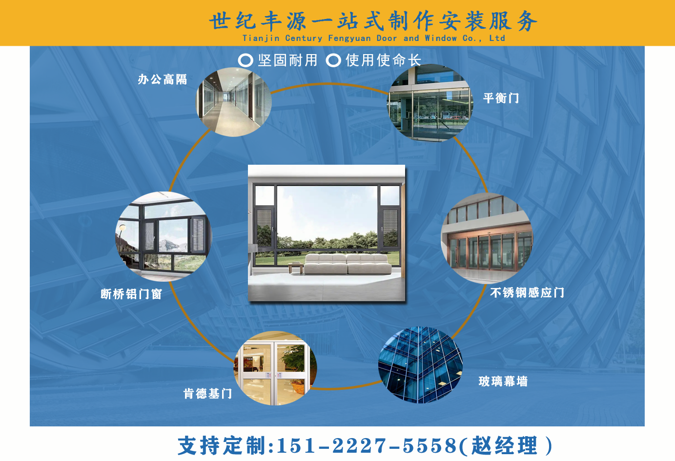 天津世紀豐源門窗有限公司從事斷橋鋁門窗,玻璃幕墻,平衡門,肯德基門,不銹鋼感應(yīng)門,百葉窗,辦公高隔,制作安裝一站式訂制生產(chǎn)及配套服務(wù)等。 公司自成立以來,始終堅持以人才為本、誠信立業(yè)的經(jīng)營原則,薈萃業(yè)界精英,成熟的技術(shù)、管理方法及企業(yè)經(jīng)驗與國內(nèi)企業(yè)的具體實際相結(jié)合,為企業(yè)供給各個方面的解決方案,使企業(yè)在激烈的市場競爭中始終堅持競爭力,實現(xiàn)企業(yè)快速、穩(wěn)定地發(fā)展。 質(zhì)量好、服務(wù)好、才能信譽好,公司已在諸多領(lǐng)域取得輝煌成績,愿意成為您可信賴的長期合作伙伴?! ∽屛覀償y手同行,共同實現(xiàn)“讓普通老百姓都用得上高端門窗”...
