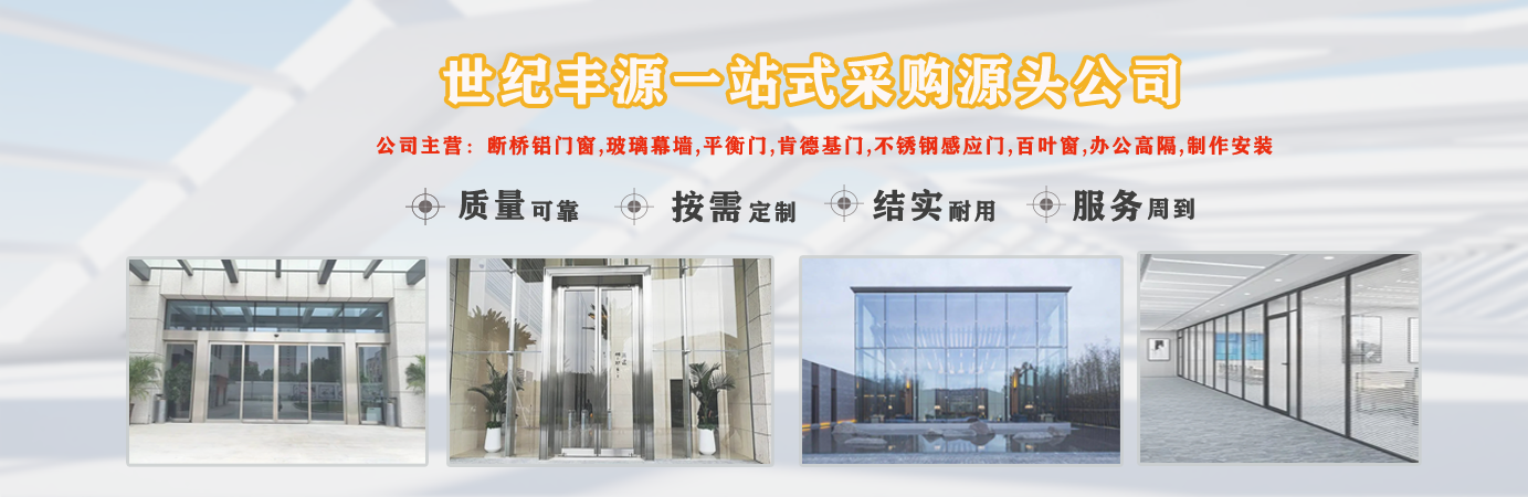 天津世紀豐源門窗有限公司從事斷橋鋁門窗,玻璃幕墻,平衡門,肯德基門,不銹鋼感應(yīng)門,百葉窗,辦公高隔,制作安裝一站式訂制生產(chǎn)及配套服務(wù)等。 公司自成立以來,始終堅持以人才為本、誠信立業(yè)的經(jīng)營原則,薈萃業(yè)界精英,成熟的技術(shù)、管理方法及企業(yè)經(jīng)驗與國內(nèi)企業(yè)的具體實際相結(jié)合,為企業(yè)供給各個方面的解決方案,使企業(yè)在激烈的市場競爭中始終堅持競爭力,實現(xiàn)企業(yè)快速、穩(wěn)定地發(fā)展。 質(zhì)量好、服務(wù)好、才能信譽好,公司已在諸多領(lǐng)域取得輝煌成績,愿意成為您可信賴的長期合作伙伴?! ∽屛覀償y手同行,共同實現(xiàn)“讓普通老百姓都用得上高端門窗”...